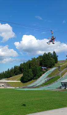 im hiesigen Olympiastadion den Flying Fox. An einem Stahlseil entlang