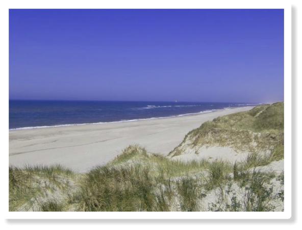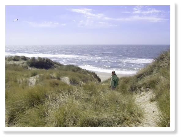 Gräsern. Vom Kamm der nächsten Dünen laufen wir durch feinen, warmen Sand abwärts zur See. Die Nordsee wirft heute