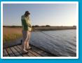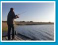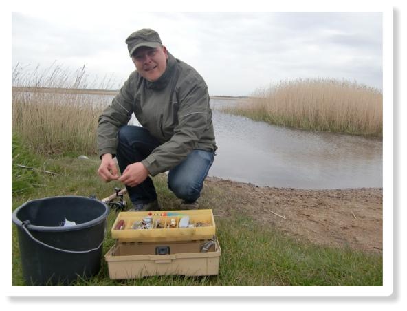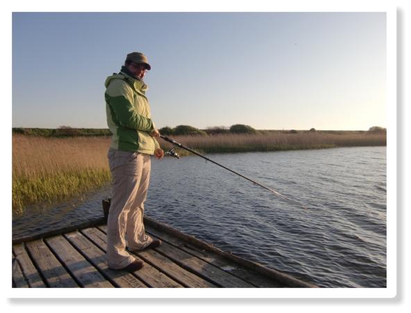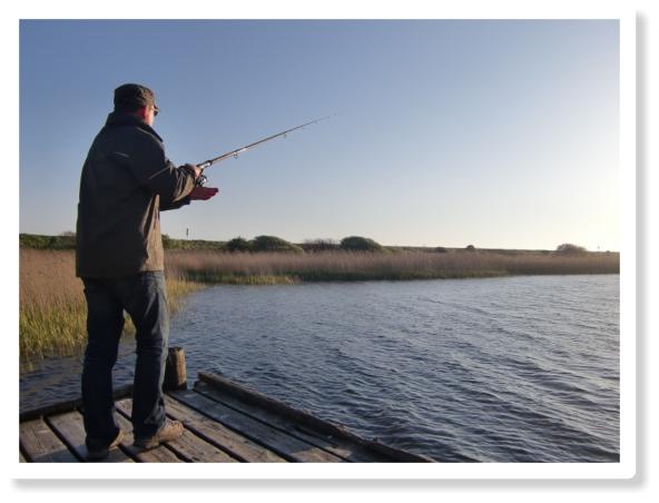 Fangplatz für Hechte und Barsche geben. Mit zwei Angeln ausgerüstet nehmen wir auf einem Holzsteg, der weit ins Wasser