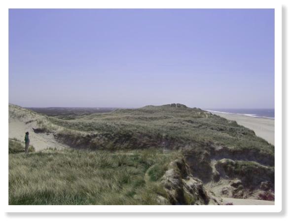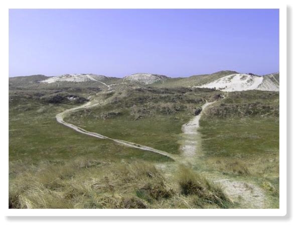 uns und der Nordsee liegt. Viele kleine Wege schlängeln sich durch den Sand, gesäumt von niedrigen Büschen und