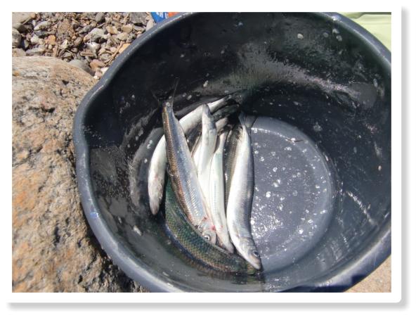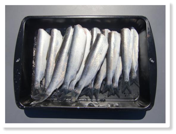 erste Hering an der Schnur. Weitere folgen, so dass wir nach einer guten Stunde 12 Fänge zu verzeichnen haben.Wir sind