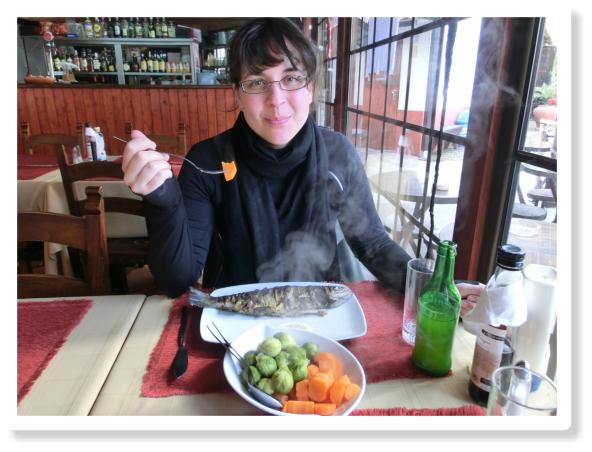 Die es schon Mittagszeit ist, besuchen wir zuerst das Restaurant und probieren - natürlich Forelle. Gegrillt. Ein Genuss.